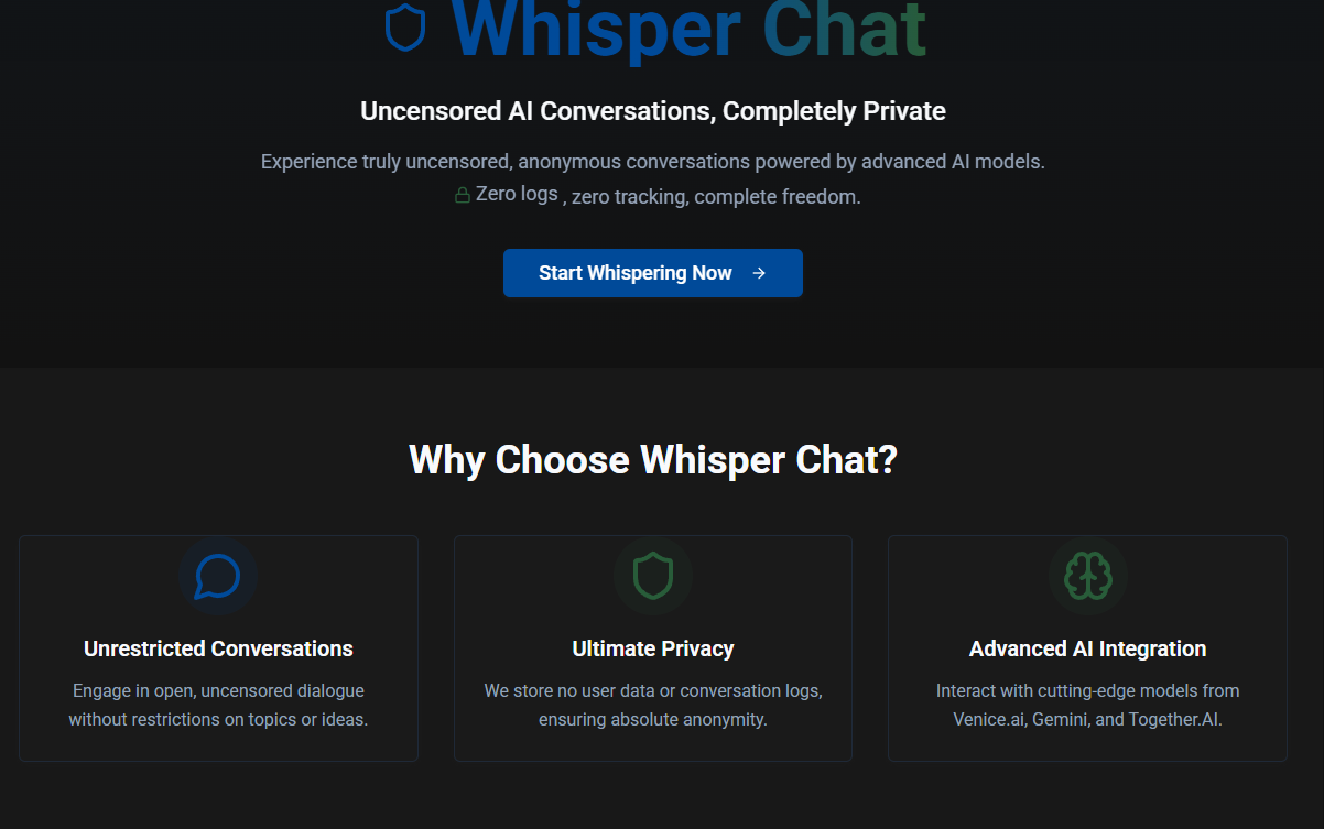 Whisper Chat is AntiAI’s private, pay-as-you-go gateway to Venice.ai—giving you flexible access without locking you into another monthly subscription. Load credits only when you need them, chat privately, and stay in control of how you use AI.